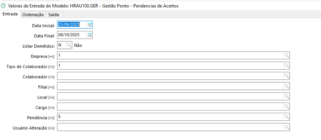 O relatório permite visualizar todas as pendências geradas pelo módulo Gestão do Ponto, com filtros completos para facilitar sua análise: